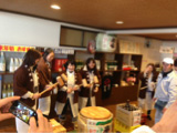 場所を移して、展示室へ。 ここでは、「鏡割り」体験をしました。選ばれた精鋭5名で、「よいしょ〜」の大きな掛け声と共に鏡割りをしました。樽香のきいたお酒で乾杯。 そしてお酒の合うつまみと共に懇親会・打ち上げにはいりました。それぞれがお酒を飲みながら、見学・体験した感想を話し合い、大変盛り上がりました。